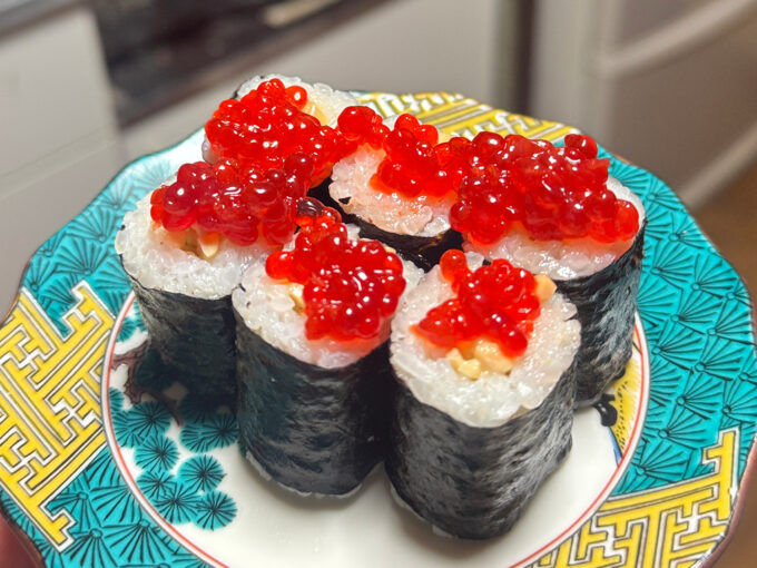 スーパーなどで販売されている市販の納豆巻きに、ハサミで切った醤油筋子をのせるだけと、「秒」でできます。