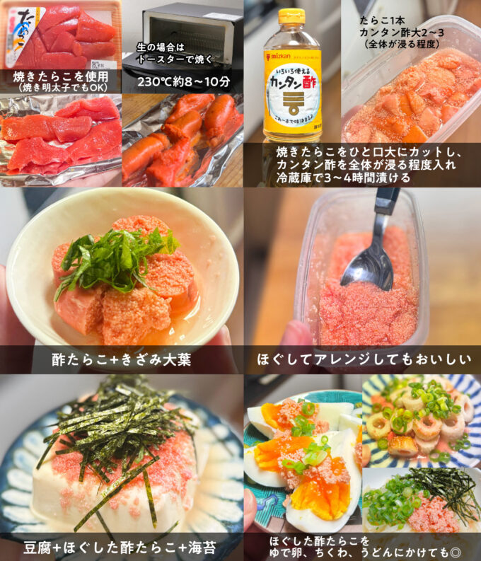 作り方はシンプルで、焼きたらこをカンタン酢に漬けるだけ。まろやかな甘酸っぱさに、たらこの塩気と旨みが合わさってクセになります。