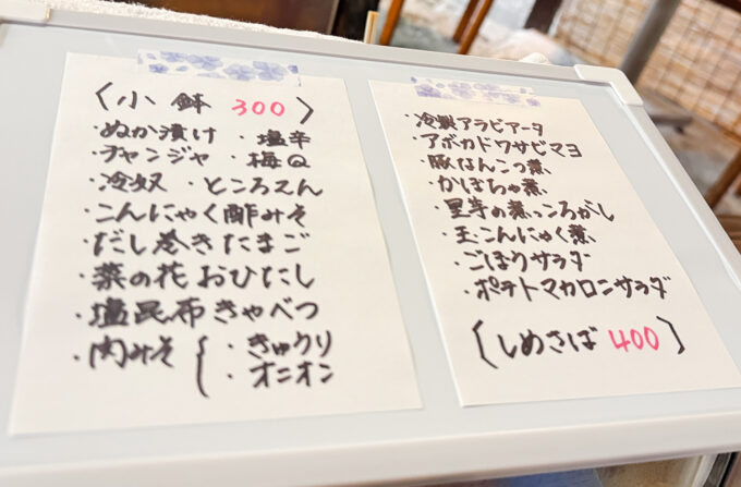 お酒は芋焼酎250円からあり、日本酒350円、角ハイボール400円、ホッピーセット500円、チューハイセット500円など。