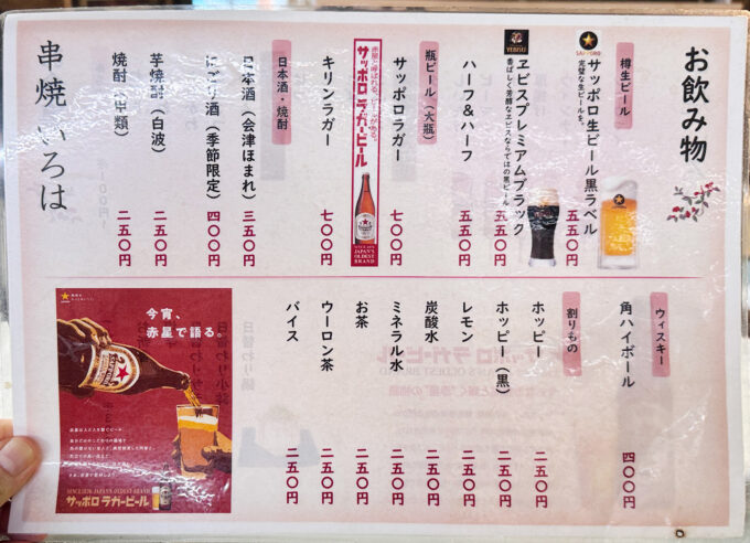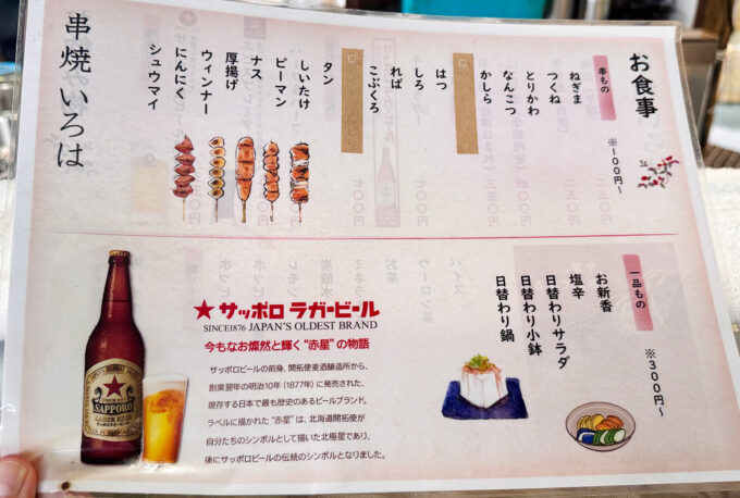 メインの串焼は1本100円からで、焼き鳥・やきとん・野菜焼きなどが並びます。