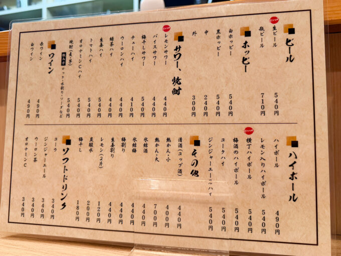 お酒は410円~。生ビール、瓶ビール、チューハイ、サワー類、ホッピーセット、各種ハイボール、日本酒など。