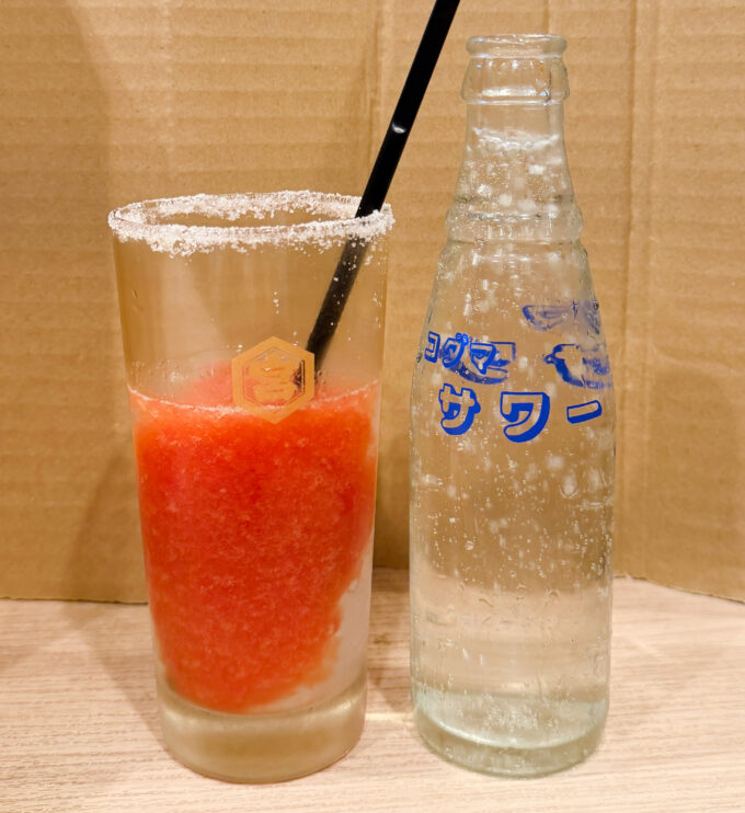 シャリキンに濃厚なトマトが入った爽やかな一杯。コップのフチについた塩がアクセントで、こってりしたもつ焼きとよく合う。