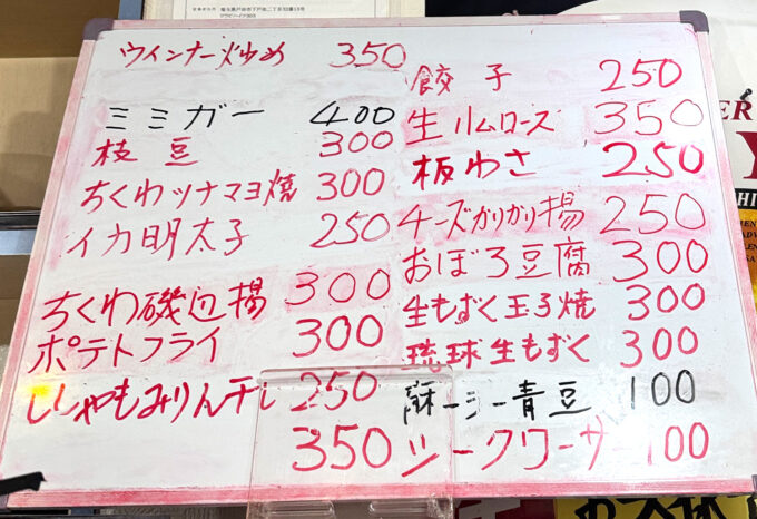 通常のお酒の価格帯は、サワー類350円、ホッピーセット450円(中250円)、ハイボール400円、スーパードライ生500円、松竹梅400円、泡盛400円など。