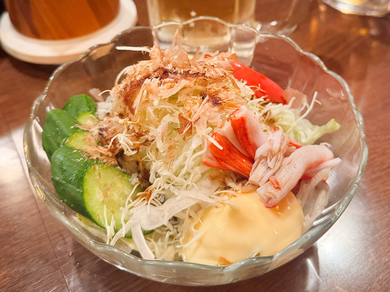 キャベツの上には、きゅうり、トマト、レタス、カニカマ、そしてかつお節とマヨネーズ。ここに、お醤油をかけて食べるシンプルなもの。