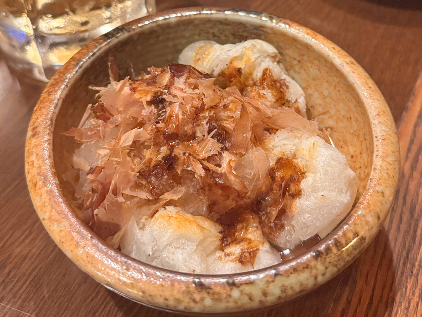 〆におすすめなのが、焼餅にかつお節と大根おろしががのった「からみもち」。ここにお醤油をたらして食べる。