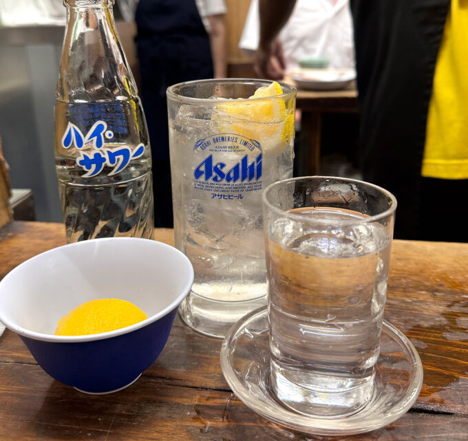 目の前で、なみなみ注がれたキンミヤ焼酎・炭酸・カットレモンが登場。