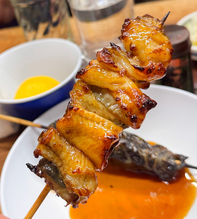 うなぎの串焼きは、からくりをはじめ、きも、ひれ、かしら、塩焼きなどが並びます。