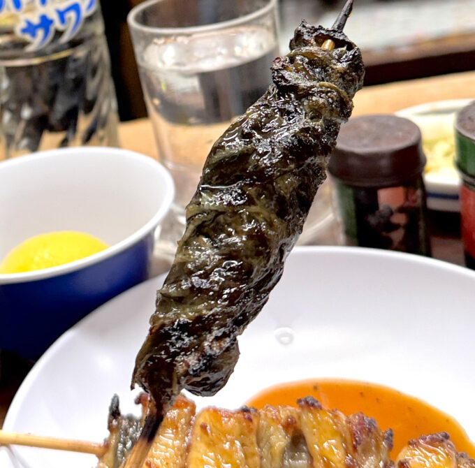 ひれ焼きは、背びれや腹びれなどをニラといっしょに串に巻いて焼いたもの。店によって少し個性が出るのも、面白い部位だったりする。