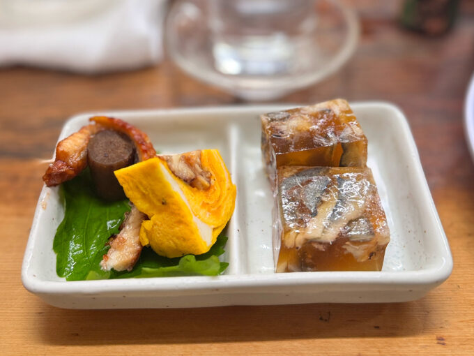 八幡巻(ごぼうのうなぎ巻き)、う巻き、うなぎ煮こごりのラインナップ。なんだかおせち料理みたいな感覚で、ちょっと豪華な一皿。