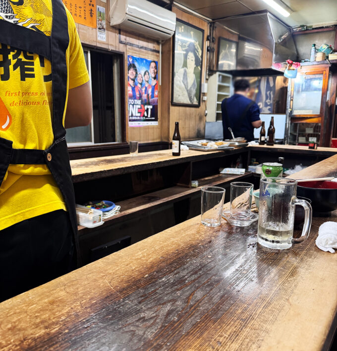 年季の入った店内には、使い込まれたコの字カウンターが伸びていて、20名も入らないほどの空間。