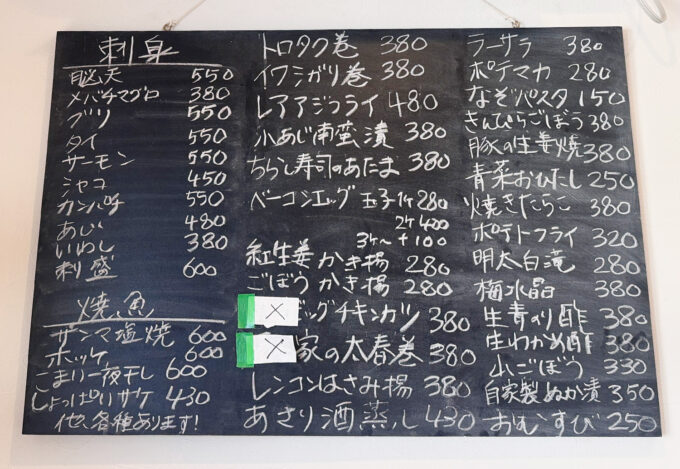 おつまみは、一部日替わりのようで、刺身単品や刺身盛り、焼き魚、トロタク巻き、イワシガリ巻き、レアアジフライなど、魚料理がずらり。