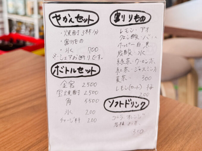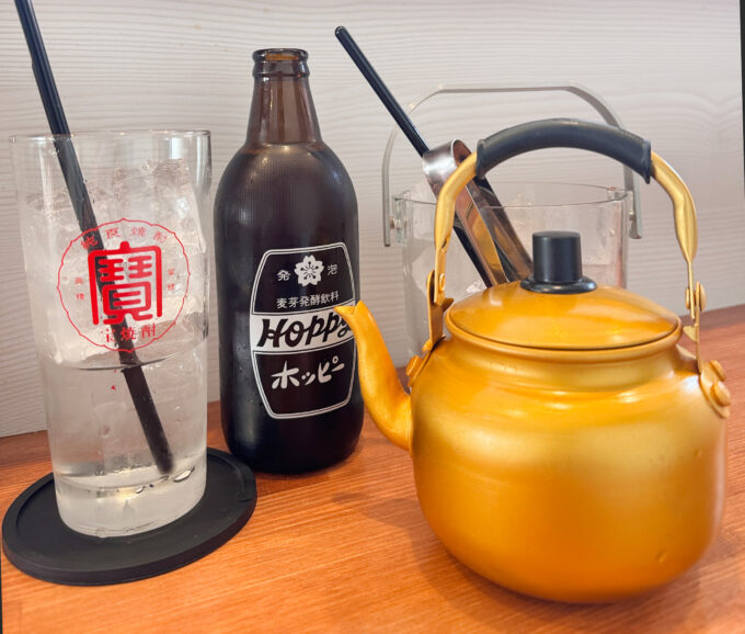 やかんセットなるものもあり、焼酎3杯分+割り物+氷で700円とお得に楽しめる。ホッピー勢にはありがたい限り✨