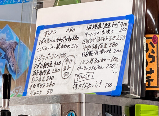 さらに、ベーコンエッグやぬか漬けといった定番ものがありつつ、「ちらし寿司のあたま」や「なぞパスタ」など、呑兵衛ごころをくすぐる創作メニューが並んでいたりも。