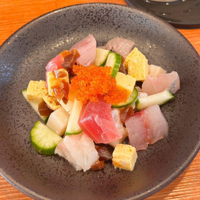 「ちらし寿司のあたま」は、お刺身のほか、胡瓜や玉子、しいたけなど、いろんな味がしてつまみに最高。考えた人、天才だなぁ✨
