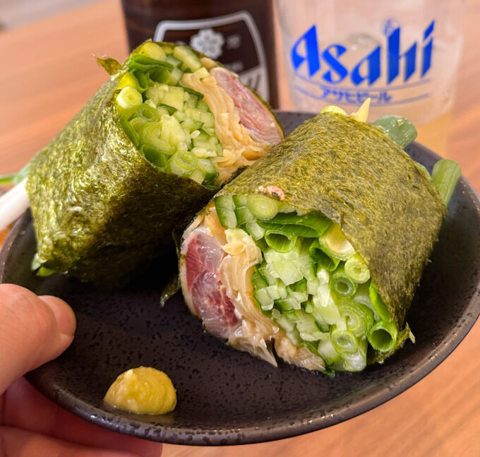 大きく口を開けてかぶりつくと、脂ののったイワシに爽やかなガリ、シャキシャキの胡瓜とほろ苦いねぎが絶妙な塩梅で混ざり合う。