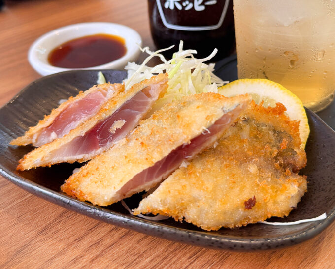 「レアアジフライ」は、揚げたて熱々で、サクっと軽い衣の中から、しっとりジューシーなアジの旨みがあふれる。