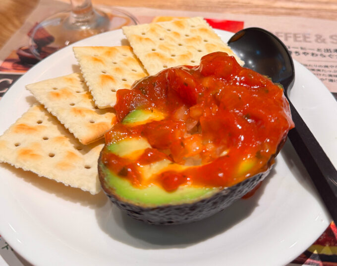 たっぷりのサルサソースがかかっていて、アボカドのくぼみには刻みたまねぎ。