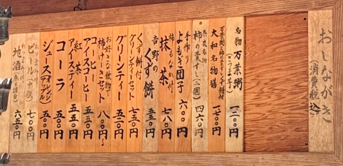 表のお品書きを眺めると、創業当初からの看板メニューだという「万葉粥」や奈良名物「柿の葉寿司」、さらに「ビール中瓶」や「地酒」まである!