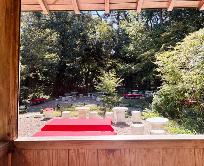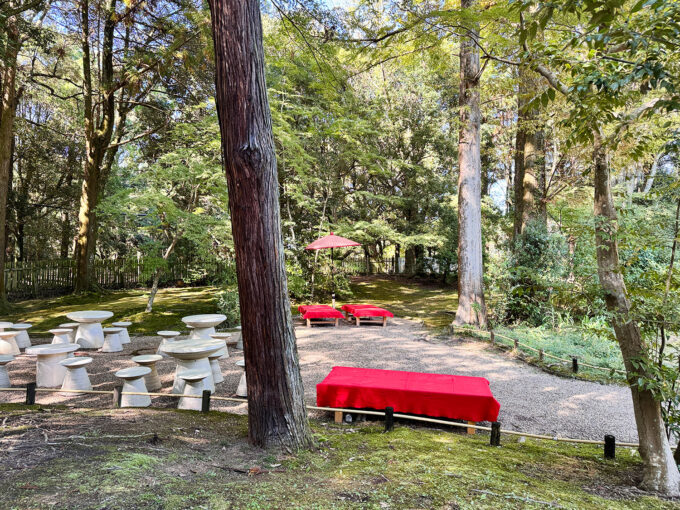 店内がほぼ満席なので、庭園の空いている席にしようかな。ぐるりを見渡すと……