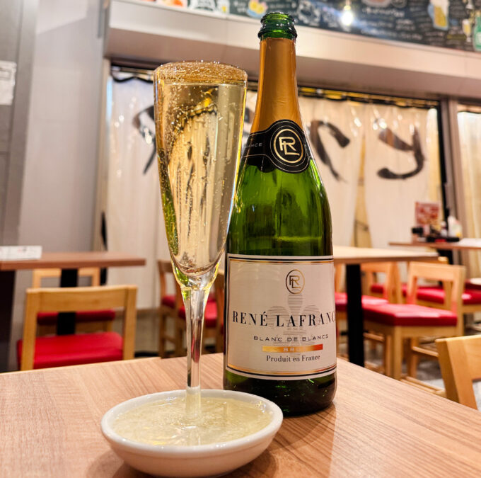 銘柄はフランス産の「ルネ・ラフランス」。爽快でドライ寄り、飲み疲れしない辛口のスパークリングで、ビフテキにもアヒージョにも合う万能選手。