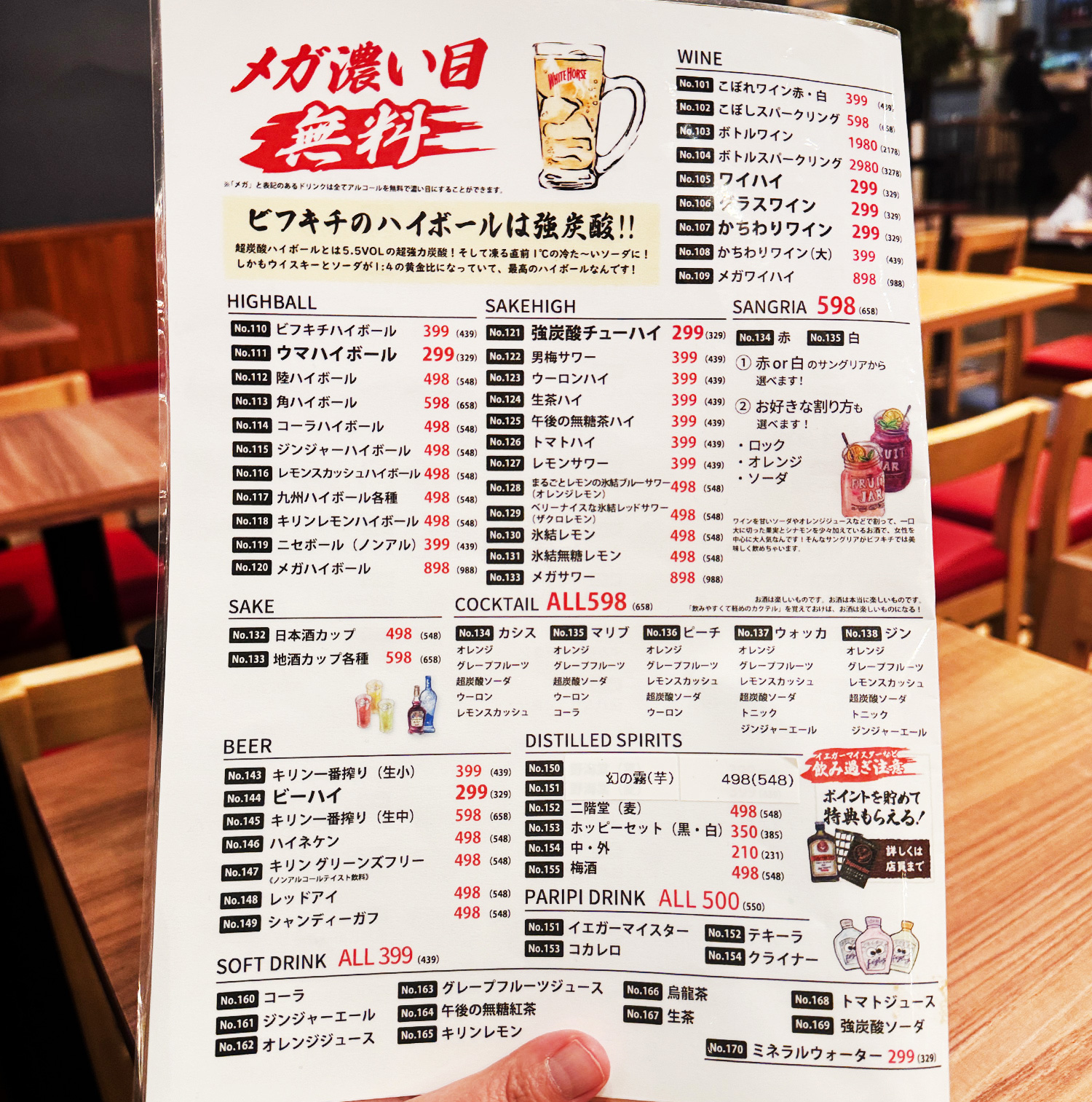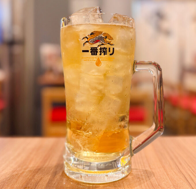 呑兵衛として特筆したいのは、メガサイズの場合にはアルコールを無料で濃いめにできる点と、ハイボール類は強炭酸で提供されている点。