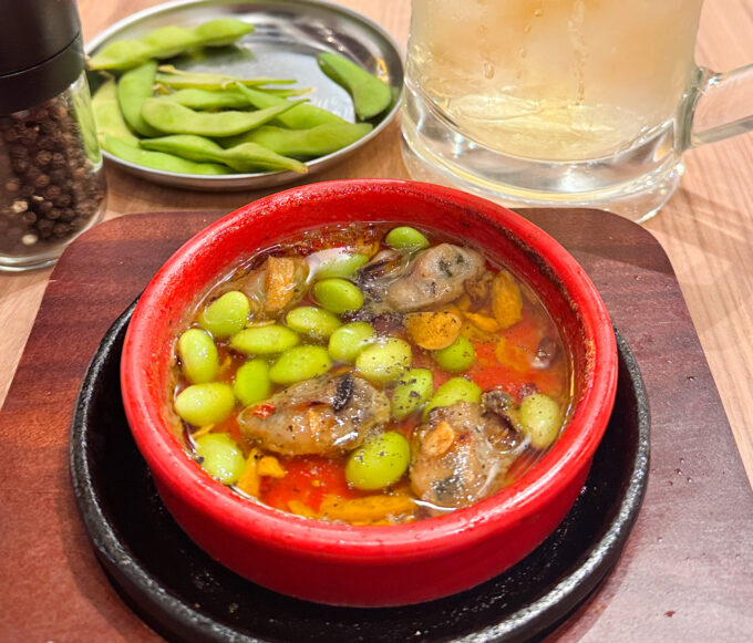 そんな牡蠣のアヒージョに、お通しの枝豆をプチプチっと投入!仕上げに、卓上のブラックペッパーをガリガリガリ。