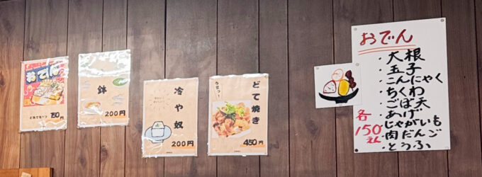 おつまみは150円~。乾きものやおでん、小鉢おかずからどて焼まで。