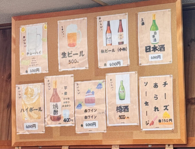 チューハイをはじめ、ハイボール、生ビール(500円)、瓶ビール小瓶、芋・麦焼酎、日本酒上撰、樽酒(500円)、赤・白ワインなど。