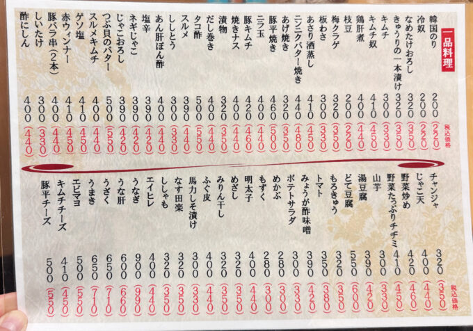システムは口頭注文・伝票式の後払いで、お通し200円がかかります。