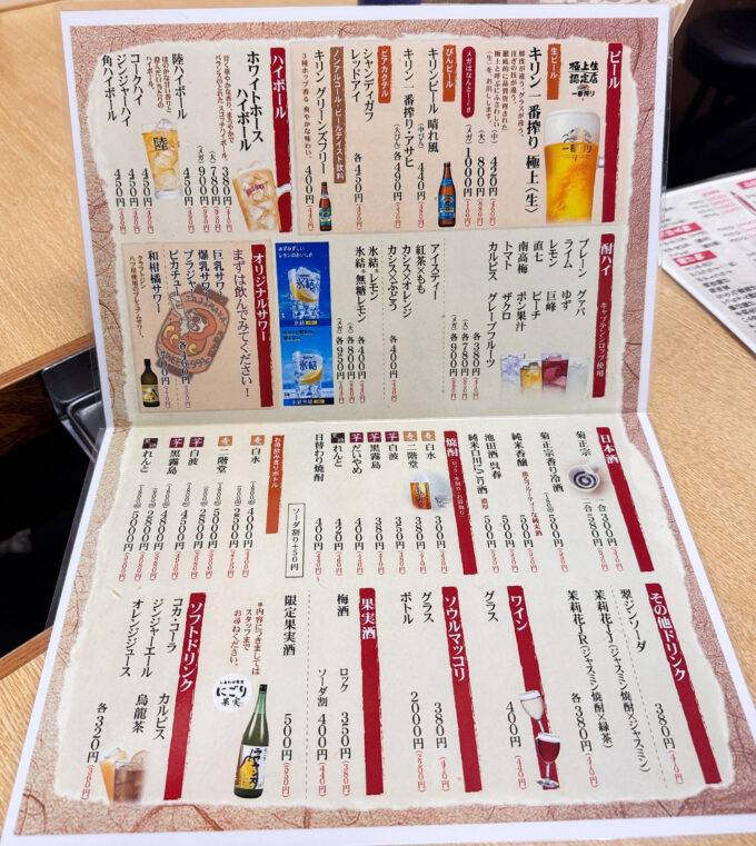 麒麟一番搾り極上生(極上なんてあるんだ!)をはじめ、一番搾り・アサヒ大瓶、晴れ風中瓶、酎ハイ類、ハイボール各種、菊正宗などの日本酒、本格焼酎、ワイン、マッコリなど。
