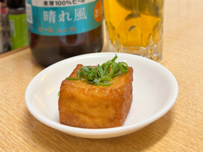 お通しは「厚揚げの甘辛煮」。甘じょっぱく、濃い味付けでお酒がすすむ仕様。