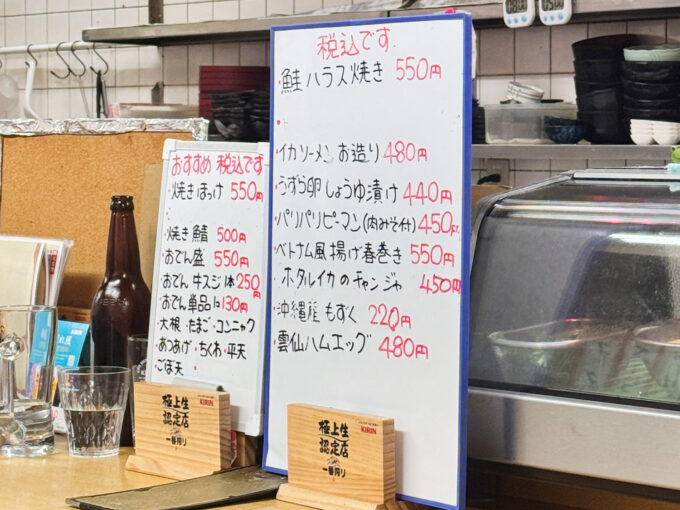 カウンター席もありますし、一人飲みもサシ飲みもしやすいお店ですが、おつまみによってはしっかりボリュームがある印象。はしごをするなら、サシ飲みでシェアしながら楽しむのがちょうどよさそう。
