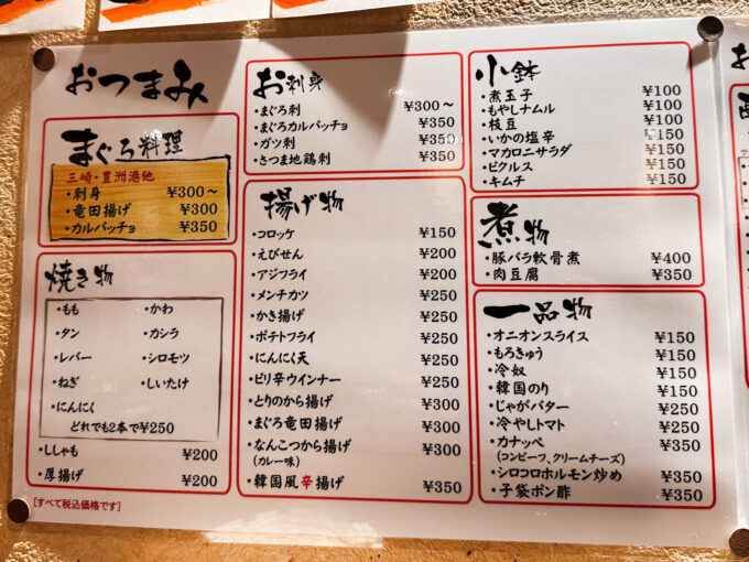 三崎・豊洲直送のまぐろ料理やお刺身、焼き鳥など串焼き、揚げ物、小鉢、豚バラ軟骨煮や肉豆腐などの煮込み、シロコロホルモン炒めやこぶくろぽん酢などのホルモン料理、さらにはカナッペやカルパッチョまで。