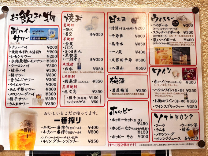 サワー類・お茶割り、ホッピーセット、陸やホワイトホースなどのハイボール、キリン一番搾り生・瓶、本格焼酎各種、日本酒、梅酒、ワインなど。
