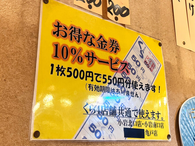 亀戸で気軽に一杯できる、チケット式の立ち飲み居酒屋「立呑み処 くら」。