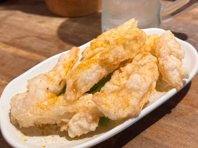おつまみは何にしようかなぁ。まぐろ料理や地鶏刺し、カナッペもそそられるけど、なんだか揚げ物を欲しているということで……