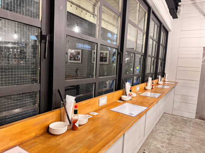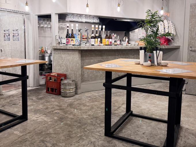 真新しくおしゃれな店内には、立ち飲み用のカウンターと、中央に大きなテーブルが2つ。30名ほどが利用できそうな広さです。