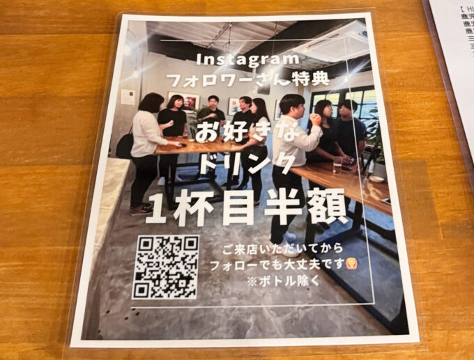 まず特筆したいのは、instagramのフォローで1杯目が半額になる点(ボトル類は除く/2025年12月13日現在)。