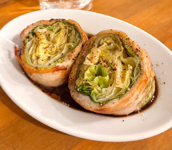 ジューシーな豚バラで巻かれた、シャキシャキのレタス。そこに、バター香る甘じょっぱい背徳ソースが絡む。
