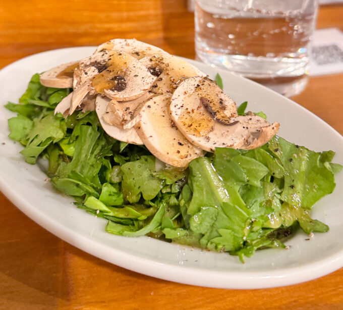 おつまみはまず「生マッシュルームと春菊のサラダ」。
