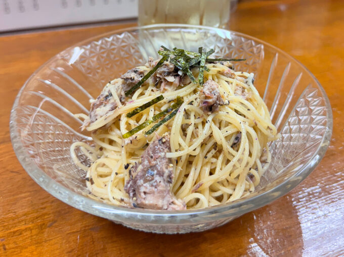 細麺だから、サバと梅がよく絡んでおいし~~~!こりゃいいつまみだ。
