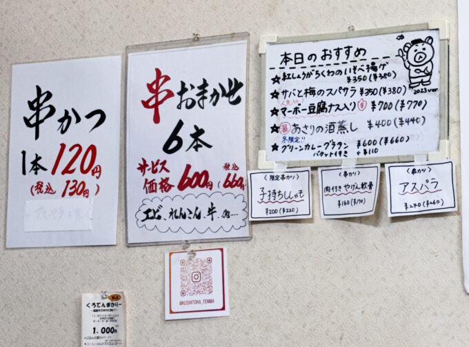 本日のおすすめも必見!創作おつまみや限定の串かつが並びます。