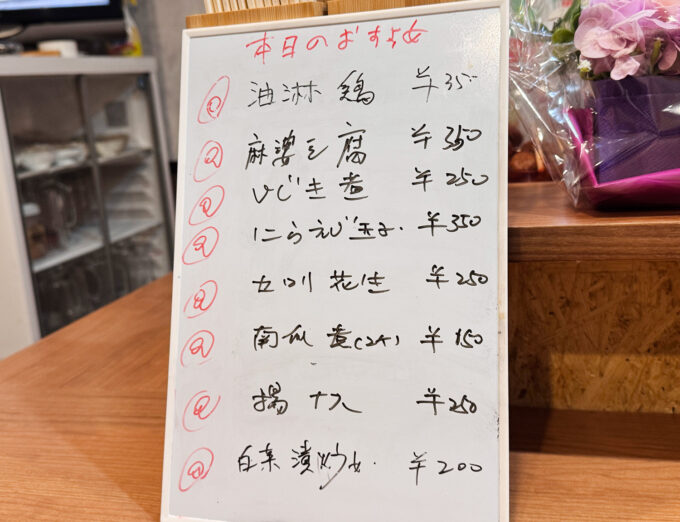 本日のおすすめには、日替りの中華おつまみが並びます。