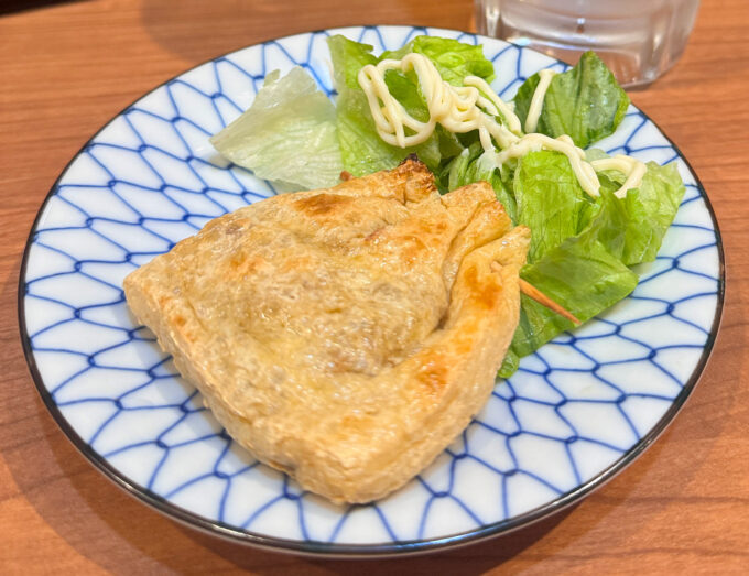 「納豆包み」は、納豆が入った油揚げを焼いたもの。葉ものが添えられているのが、うれしい。