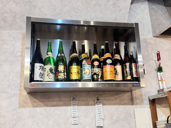 チューハイ類をはじめ、スーパードライ生、ビール中瓶、ブラックニッカのハイボール、ホッピーセット、本格焼酎、日本酒、梅酒までひと通り。ソフトドリンクも揃っています。