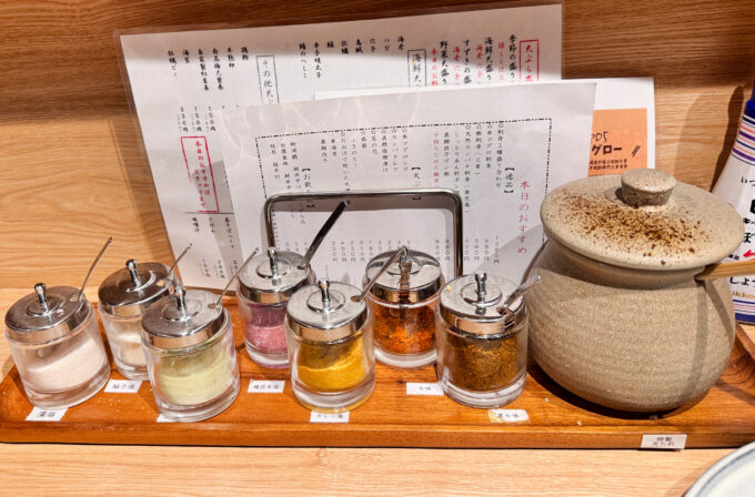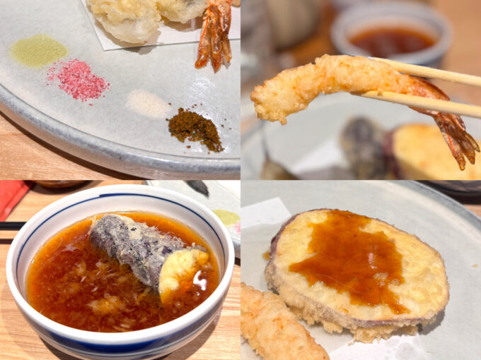 天つゆをはじめ、卓上には天たれ、藻塩や抹茶塩など4種の塩、七味や黒七味などが並んでいて、好みの味付けで楽しむことができます。
