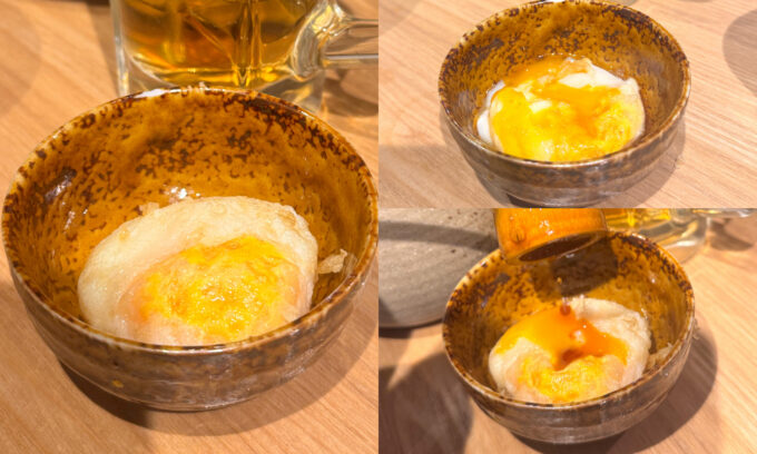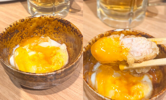 この鶏むねを半熟卵にディップしてみたら、めちゃくちゃおいしい!黒七味パラッとふっても最&高。