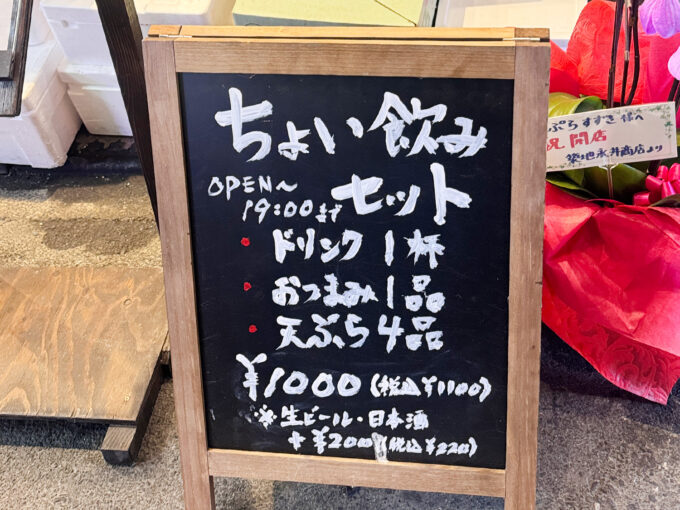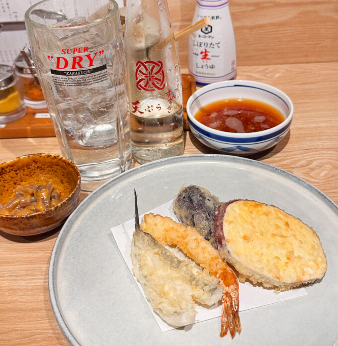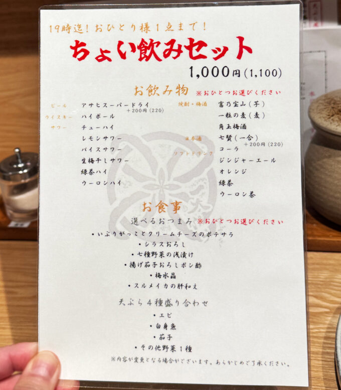 選べるドリンク+選べるおつまみ+天ぷら4種盛り合わせで1100円と、ちょい飲みしたい時にうれしいセット✨