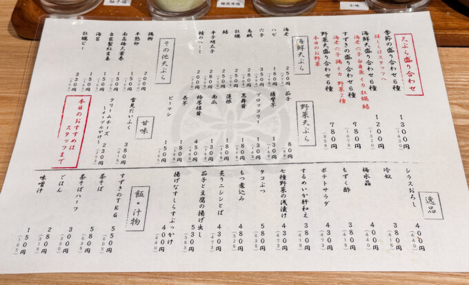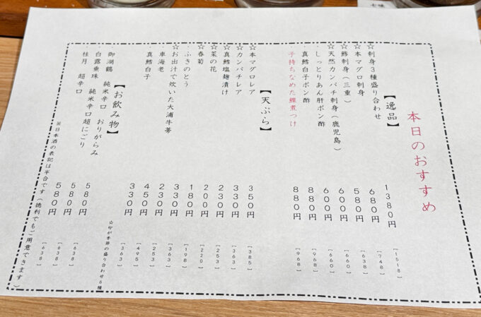 本日のおすすめには、旬のお刺身や天ぷら、日本酒が並びます。