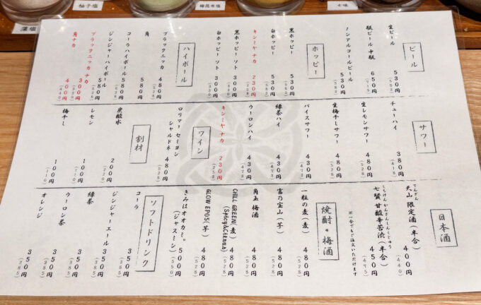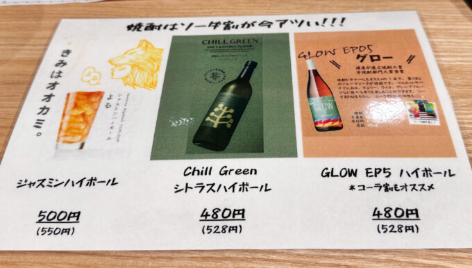 お酒はチューハイ418円からで、サワーやホッピーなどの焼酎はキンミヤ。
